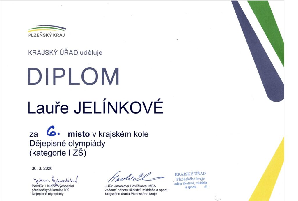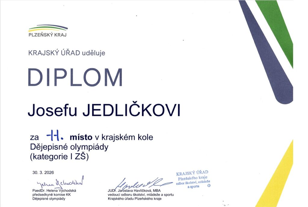 Dne 30. 3. 2026 se vydali dva vyslanci ze třídy 9. B na dějepisnou olympiádu, tentokrát se jednalo již o krajské kolo. Josef Jedlička se umístil na krásném 11. místě a Laura Jelínková na ještě lepším 6. místě.