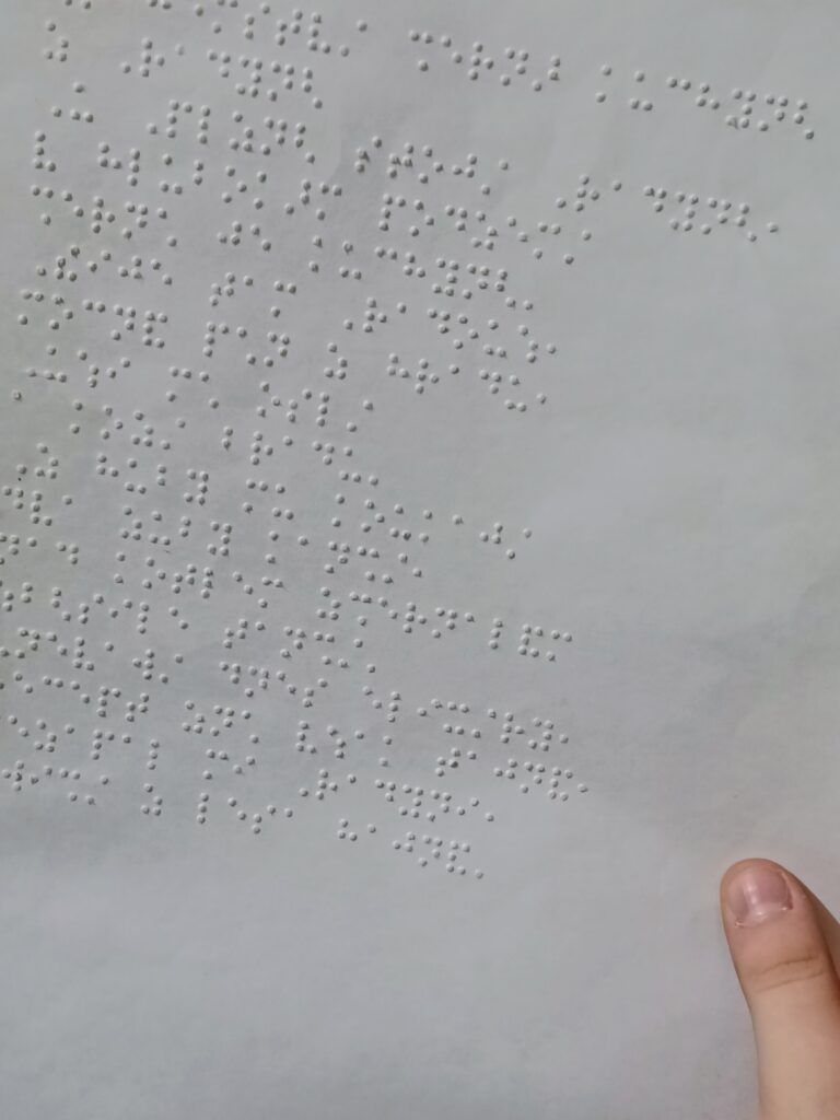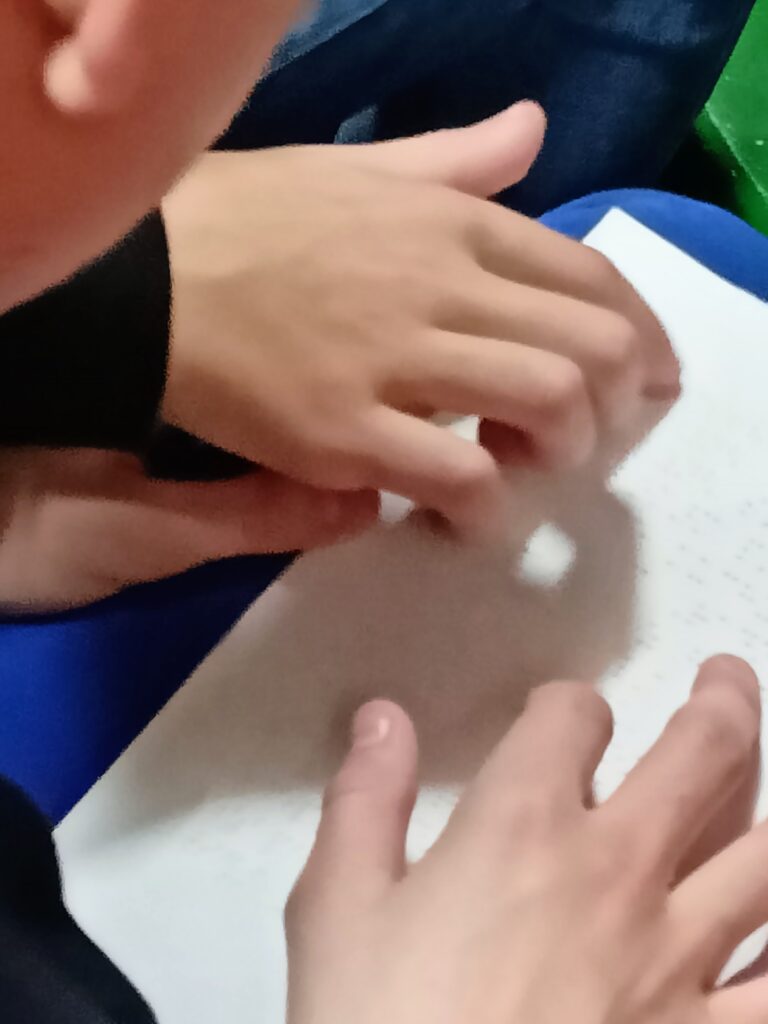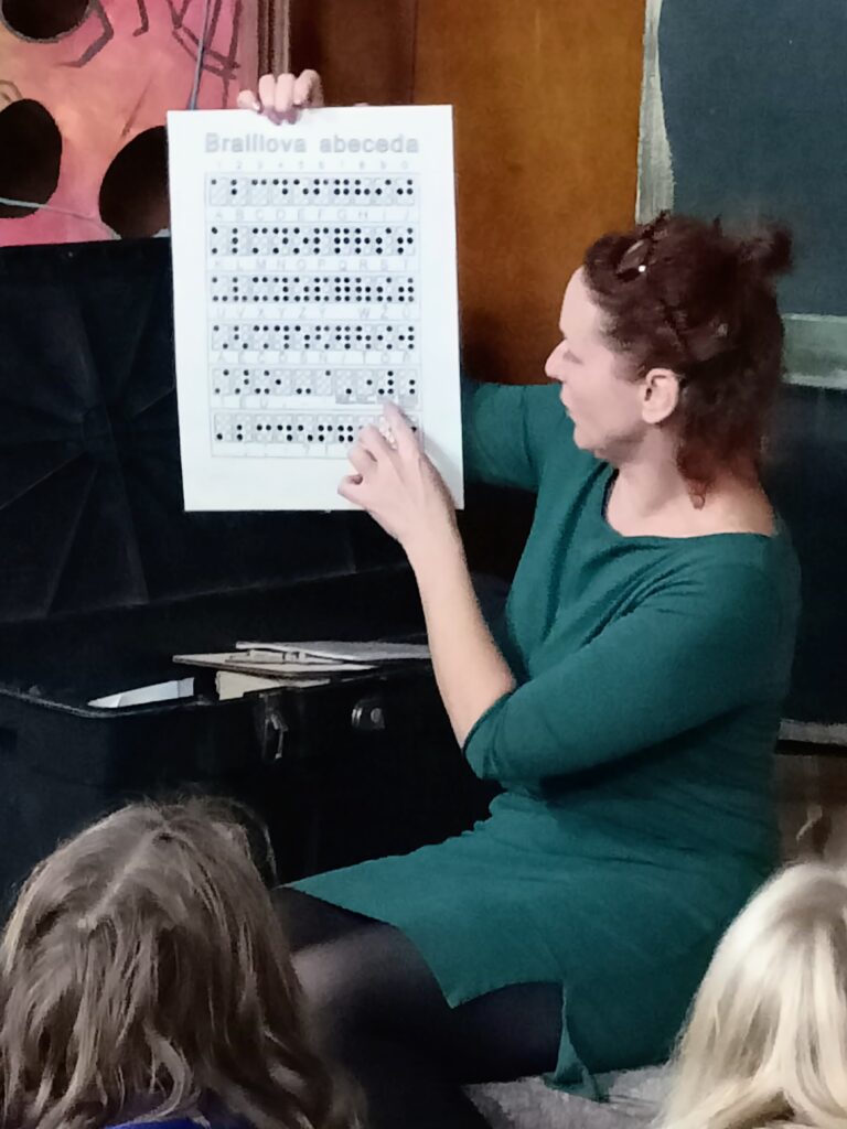 Průvodkyně nám ukázala pomůcky, které používají nevidomí, prohlédli jsme si text napsaný Brailovým písmem, potěžkali jsme si slepeckou hůl,….. Povídali jsme si o tom, jak můžeme pomoci nevidomým, jak jim můžeme ulehčit život, ale seznámili jsme se i s tím, jak si chránit zrak a proč vůbec si chránit zrak. A co se stane s naším tělem, když o zrak přijdeme.