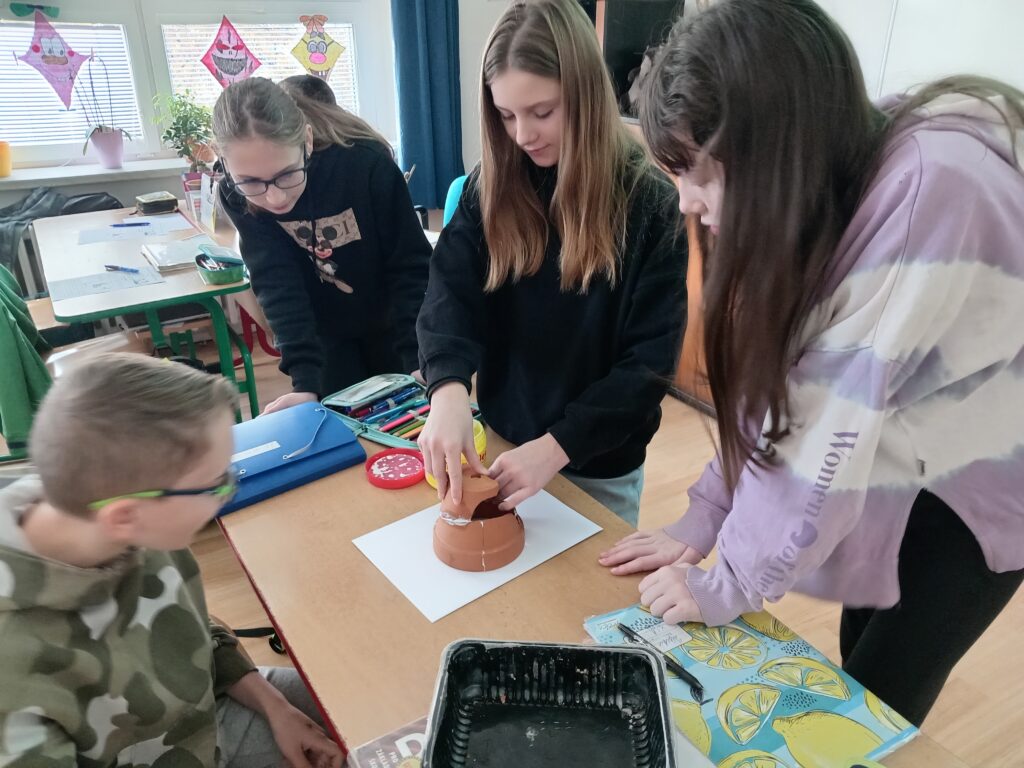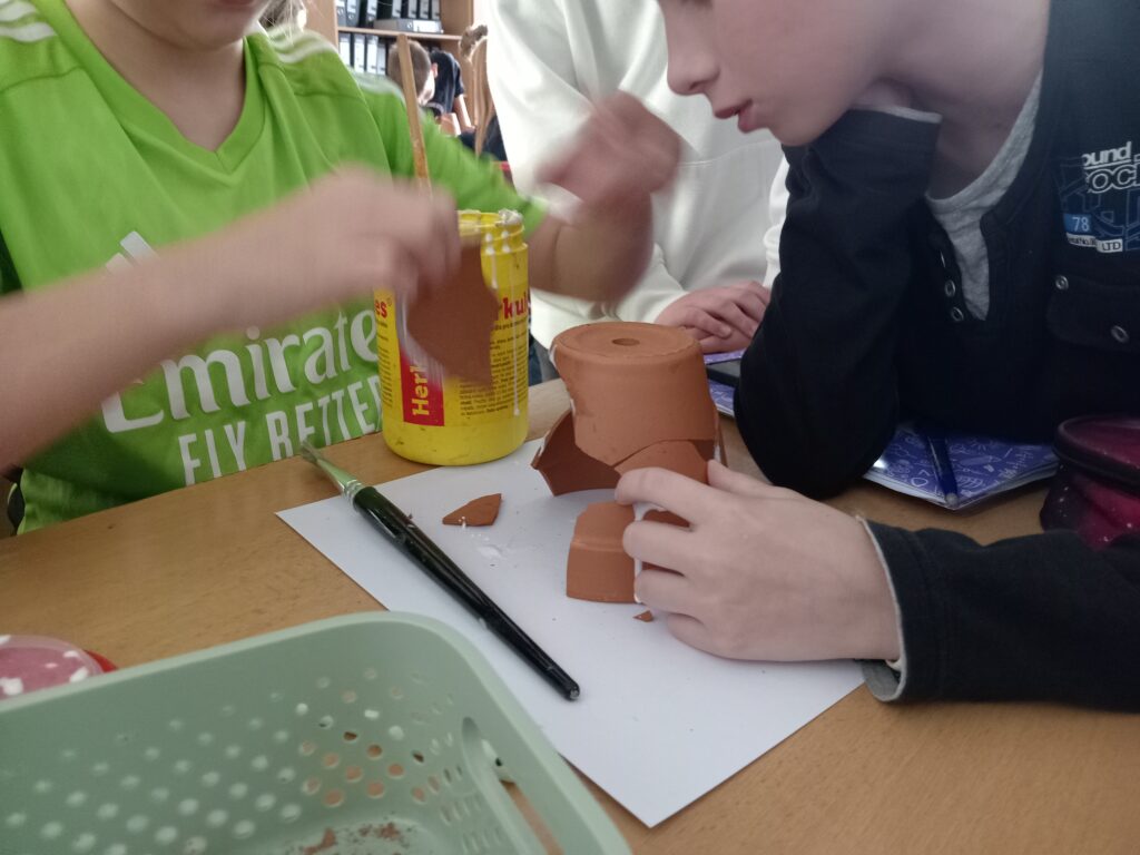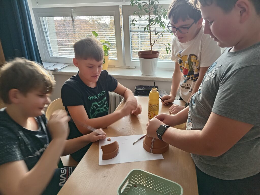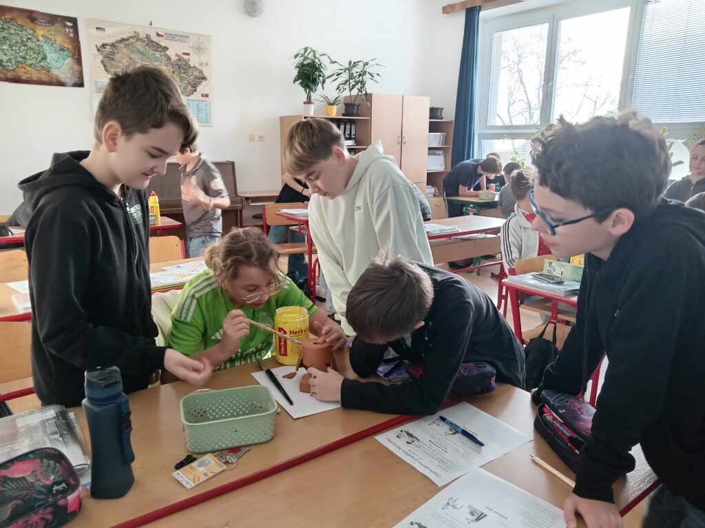- Jsem archeolog – povídání a promítání o archeologii střídala aktivita ve skupinách, kdy měli ze “střepů” za pomoci obyčejného tekutého lepidla sestavit artefakt. Nebylo to ovšem tak jednoduché, jak se na první pohled zdálo. Žáci museli přijít na správný postup, jak střepy seskládat. Zároveň v každém košíčku se “střepy” jeden nebo dva kusy chyběli. Nakonec jsme si vše zapsali do svých pracovních listů a blok s dílčími aktivitami zhodnotili v reflexi.