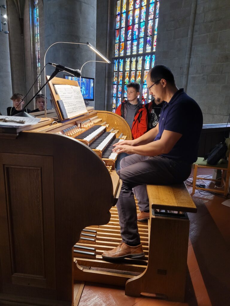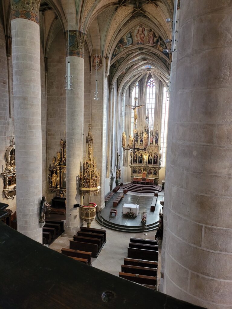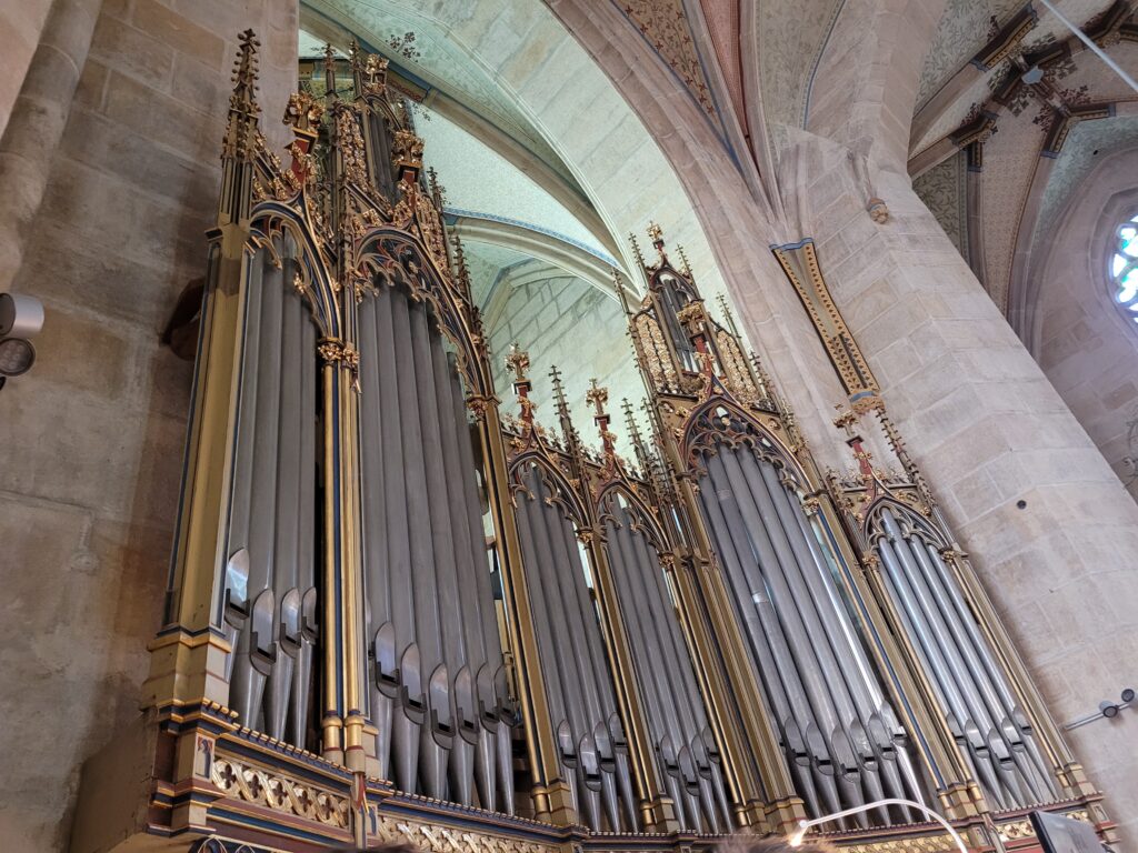 Protože jsme před domluvenou akcí měli čas, využili jsme nabídku navštívit katedrálu sv. Bartoloměje a prohlédnout si prostory na kůru (na vyvýšených prostorech pro varhany a zpěváky) a hlavně si ty varhany prohlédnout a slyšet je znít.