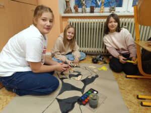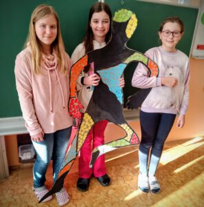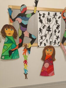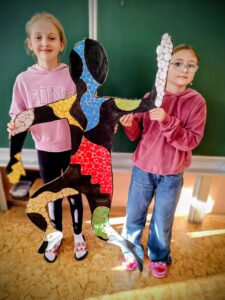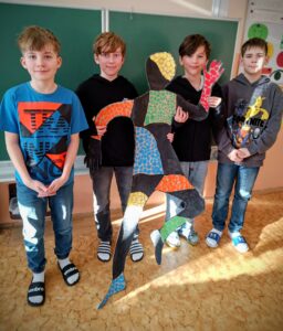 Vznikly tak originální a pestré postavy, které působí živě a dynamicky. Pracovali jsme ve skupinách. Rozdělili jsme si činnosti a společně hodnotili naše výtvory. Povídali jsme si o tom, jak pohyb vyjadřuje emoce, energii a náladu, a jak barvy a koláž mohou obraz obohatit.
