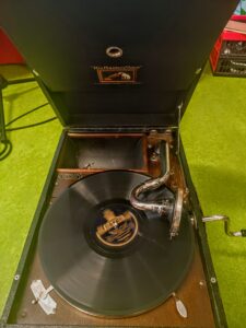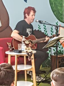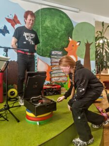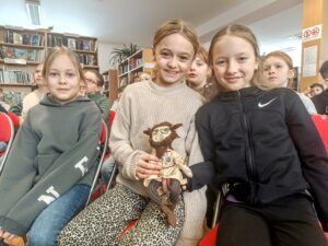 Ve zručské knihovně nás navštívil místní rodák a známý hudebník Petr Déma Škabrada, jehož dlouholetým koníčkem je historie a shromažďování pověstí o Plzni a plzeňském okolí. Pověsti zhudebňuje nebo tvoří vlastní autorské texty. Jeho vypravování doplněné zpěvem a hrou na kytaru bylo velice poutavé a písničky chytlavé. Rychle jsme se do zpěvu také zapojili. Zaujala nás třeba pověst o nedalekých lesích Spálenka nebo Zápovědnice, o Čtveráku se čtyřmi lipami, Martinovi a kouzelné lampě, o vodníkovi z rybníka Drahotín, o zřícenině hradu Věžka v Druztové s ukrytým pokladem se zlatými vejci a mnoho dalších. Dozvěděli jsme se zajímavé informace o původní Plzni ve Starém Plzenci a o založení současné Plzně českým králem Václavem II. v roce 1295 na soutoku čtyř řek. Také nám pustil 100 let starý gramofon, jehož mechanismus funguje na pérový pohon. Než je natažený a připravený přehrát vinylovou desku, musí se asi 40 krát otáčet klikou.