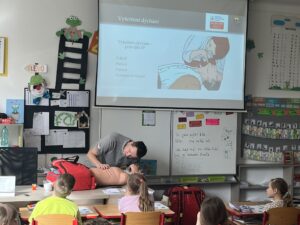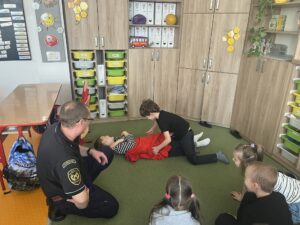 Teprve poté se slova ujal záchranář, který nám přiblížil svět první pomoci. Společně jsme si zopakovali nejdůležitější telefonní čísla tísňových linek – 150, 155, 158 a jednotné evropské číslo 112. Děti se naučily, jak správně nahlásit událost, co musí operátorovi říct a proč je důležité nikdy nezavěsit jako první. Vysvětlil nám také, jak se zachovat při požáru, proč je důležité zachovat klid a jak se bezpečně dostat z ohroženého místa.