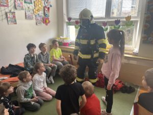 Dnešní dopoledne začalo jako každé jiné, ale brzy se změnilo v dobrodružství, na které budou děti dlouho vzpomínat. Do třídy totiž vstoupil náš první host – profesionální hasič. Už od prvního pohledu bylo jasné, že jeho práce je náročná a plná odvahy. Hasič dětem vyprávěl, jak u nich probíhá 24hodinová směna, během níž musí být stále připraveni vyjet k zásahu. Povídal o každodenním výcviku, udržování techniky, o rychlosti, s jakou musí reagovat, jakmile zazní alarm, i o tom, že nikdy dopředu neví, jaké situace během směny nastanou. Děti pozorně poslouchaly jeho příběhy plné skutečných zážitků a uvědomily si, že za každým zásahem stojí velká odvaha i týmová práce.