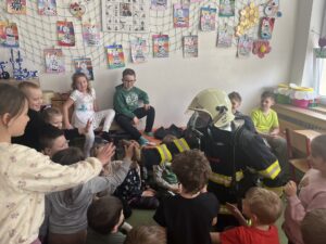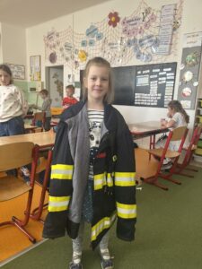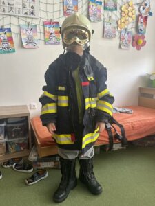 Na závěr nás čekala skvělá zkušenost, kterou jsme si všichni užili – děti si mohly vyzkoušet opravdový hasičský oblek. S nadšením si oblékaly bundu, helmu i těžké boty a na chvíli se cítily jako skuteční profesionálové připraveni vyrazit k zásahu.