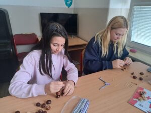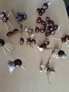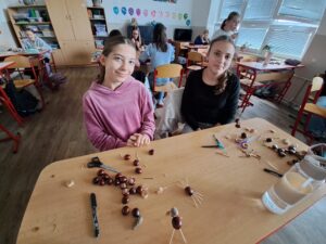 Kde je psáno, že to, co nás bavilo jako malé děti, nás nemůže bavit i dnes? Zkusili jsme si to na hodině Pracovní výchovy. Z kaštanů, párátek, klacíků, žaludů a javorových nažek jsme vyráběli zvířátka a postavičky. Hodina pěkně utekla a některé výtvory stály za to.