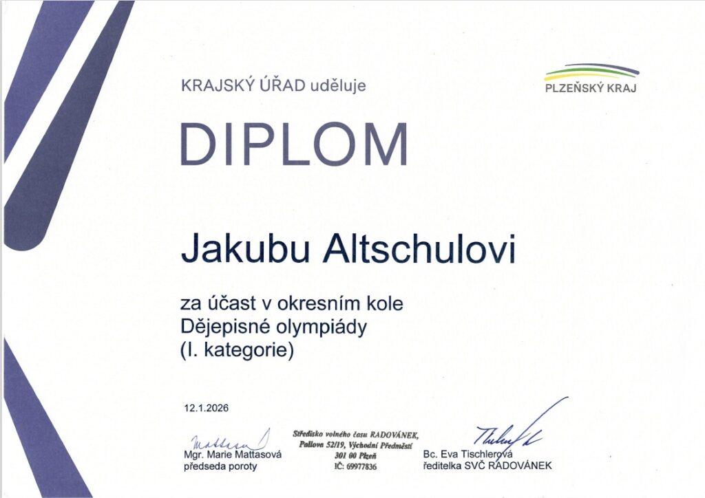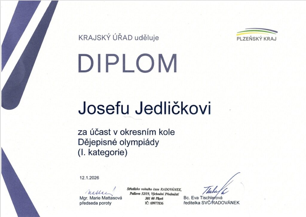 Úspěšných řešitelů jsme měli hned několik, z nichž 3 nejlepší výsledky měli Laura Jelínková, Josef Jedlička a Jakub Alstchul, všichni ze třídy 9. B. Tito byli také vysláni do okresního kola a právem. Zaujali totiž krásné příčky: L. Jelínková 2. místo, J. Jedlička 4. místo (o 1 bod) a J. Alstchul 6. místo. První dva postupují do kola krajského.