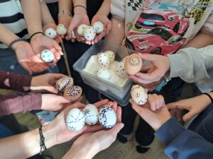 V hodinách Pv se snažíme vyzkoušet leccos. Teď před Velikonocemi si holky chtěly zkusit, jak se zdobí kraslice voskem. Některé už nebyly v této činnosti žádnými nováčky. Někdo ale tvořil kraslice touto technikou poprvé. Nestává se často, že by během hodiny bylo takové ticho. Jistě i díky nezvyklému soustředění se práce vydařila a pod rukama dívek rozkvetly originální vzory. Veselé Velikonoce!